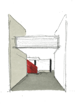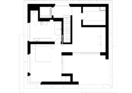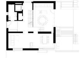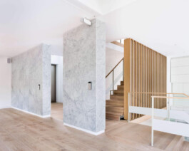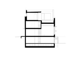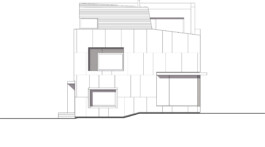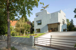 Auf einem eingewachsenen Villengrundstück in Berlin entstand ein kompakter, vielgestaltiger Kubus aus Naturstein. Der Baukörper wurde auf einer vorhandenen Geländeerhebung errichtet und musste mit einer Grundfläche von 11,5 x 11,5 Metern auskommen. Durch die Abfolge von Souterrain, Erdgeschoss, Zwischen- und Staffelgeschoss ergibt sich eine fast turmartige Erscheinung.