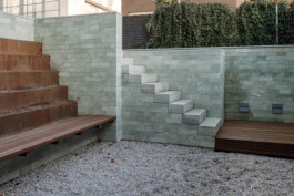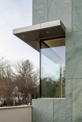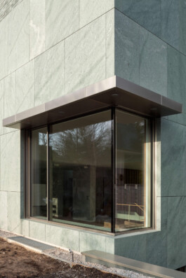 Die Fassade prägt ein Serpentinit aus Graubünden, der Verde Andeer. Seine grau-grüne Farbgebung betont den monolithischen Charakter des Bauwerks. Um Fugenbildungen an den Hausecken zu vermeiden, wurden dort besonders massive Natursteine eingesetzt. Der Stein setzt sich auch in den Außenbereichen fort und verbindet das Gebäude mit seinem Garten.