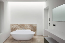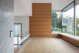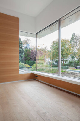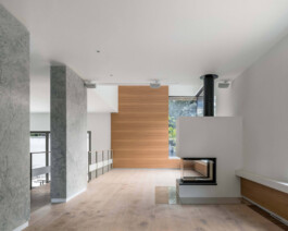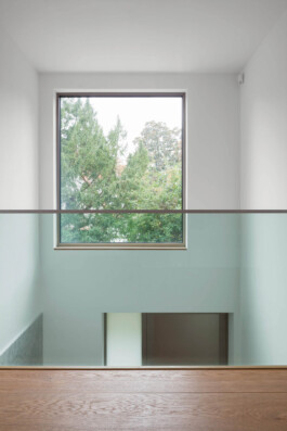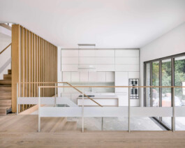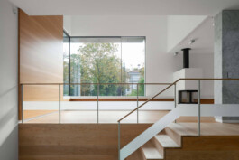 Die beiden unteren Ebenen öffnen sich ebenerdig zu den jeweiligen Gartenseiten. Das Erdgeschoss, als offener Wohnraum konzipiert, bildet den Mittelpunkt des Hauses. Im obersten Geschoss liegen der private Schlafbereich und eine Dachterrasse. Weiße Wände und Decken in Kombination mit Holzoberflächen schaffen ein ruhiges, natürliches Ambiente.