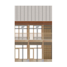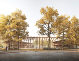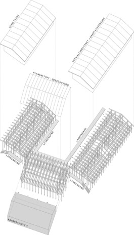 Am Rand des Geländes liegt der Bolzplatz, eingefasst von einer robusten Holzkonstruktion und geschützt durch eine wasserabweisende Textilüberdachung. In der ersten Bauphase dient er als wettergeschützte Spiel- und Pausenfläche. Später bildet er die Basis für eine Erweiterung: Eine zweite Ebene wird über dem Platz errichtet und schafft zusätzlichen Raum für schulische Aktivitäten, während der Bolzplatz darunter erhalten bleibt. Durch hochgradig vorgefertigte Holzelemente wird eine leise und Staubfreie Baustelle möglich.
