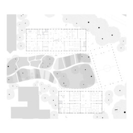 Der Haupteingang führt direkt vom Niemandsweg durch den grünen Kern des Schulhofs. Die beiden zweigeschossigen Schulhäuser sind über einen Laubengang verbunden. So können die Schüler/innen in Hausschuhen bequem zwischen den Gebäuden wechseln. Unterschiedliche Außenbereiche bieten Raum für individuelle Pausengestaltung.