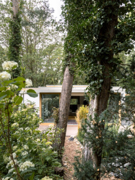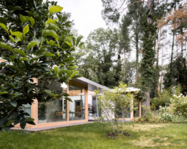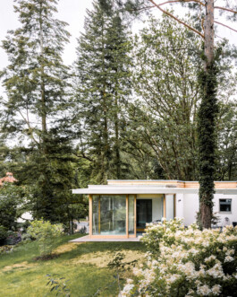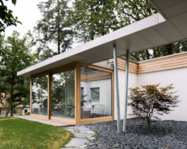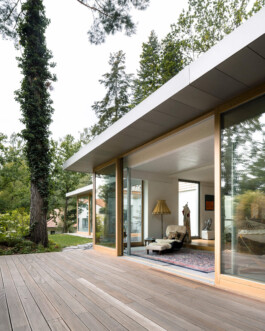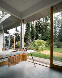 Im Zentrum liegt die Küche, flankiert von Schlaf- und Wohnbereich. Der Wintergarten vor dem Schlafraum wird als Atelier genutzt, der zweite öffnet sich als Erweiterung des Wohnbereichs zur Terrasse. Große Glasschiebetüren verbinden Innen- und Außenraum. Die Terrasse schwebt über einem Fischteich, überragt von hohen Kiefern. Ein filigranes Vordach verbindet die Wintergärten und prägt das Erscheinungsbild. Die Stützen nehmen die Form der umgebenden Bäume auf – aus einem einfachen Gartenhaus wurde ein sensibler Rückzugsort im Grünen.