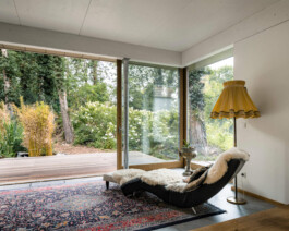 Das Erdgeschoss liegt hangseitig im Untergeschoss und orientiert sich zur Straße hin. Eine offene Treppe verbindet es mit dem eigentlichen Wohnraum im Obergeschoss, der sich zum Garten hin öffnet. Zwei neue Wintergärten ergänzen den bestehenden U-förmigen Baukörper und schaffen eine großzügige Wohnlandschaft mit fließendem Übergang in die waldreiche Umgebung. Ein intimer Innenhof entsteht, geschützt durch die kleinteilige Struktur des Gebäudes.