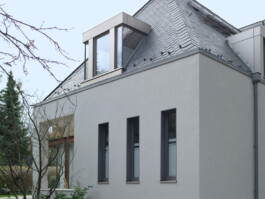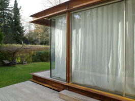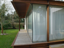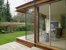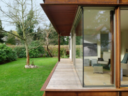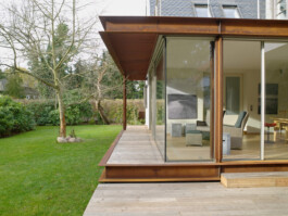 Ein neuer, verglaster Flachbau mit Dachterrasse verbindet Innen- und Außenraum. Große Schiebeelemente schaffen fließende Übergänge zum dichten Garten, in dessen Zentrum eine Magnolie steht. Cortenstahl prägt in filigraner Konstruktion die Terrasse und Veranda – inspiriert von Urlaubsbildern der Bauherren. Traditionelle Elemente wie ein Fledermausfenster, ein Korbbogenabschluss und teilweise erhaltene Blendläden ergänzen die Gestaltung.