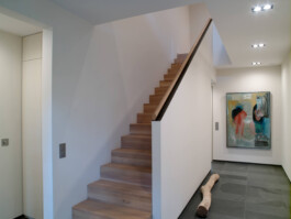 Das Gebäude organisiert sich um einen zentralen Wintergarten. Wohn- und Essbereich gehen nahtlos ineinander über, ergänzt durch eine offene Küche. Das ehemalige Wohnzimmer mit Kamin dient als Rückzugsort und wärmt zugleich die Eingangsdiele. Eine repräsentative Treppe führt ins Dachgeschoss mit Schlafzimmern und einer Empore im Spitzboden.
