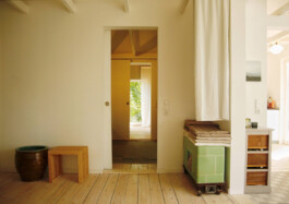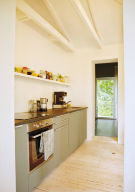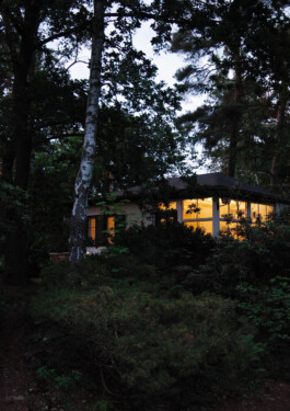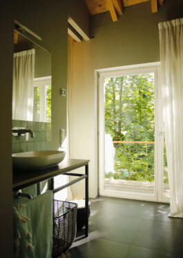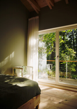 Die Neuordnung des Grundrisses schafft Großzügigkeit trotz kompakter Fläche. Blickachsen sorgen dafür, dass aus jedem Raum der Wald sichtbar ist. Im Anbau entstanden ein großes Badezimmer mit Regendusche und ein kleines Schlafzimmer – beide mit Blick ins Grüne. Die Küche wurde umstrukturiert und erweitert. Die Terrasse ist nach Sonnenstand und Baumbestand ausgerichtet.